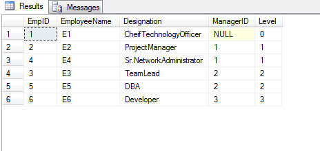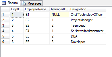 Consider a table containing EmployeeDetails with EmpID,ManagerID.EmployeeName,Designation.Here I want to get the result based on Manager Herirachy.Now we can create a table with the following T-SQL code.