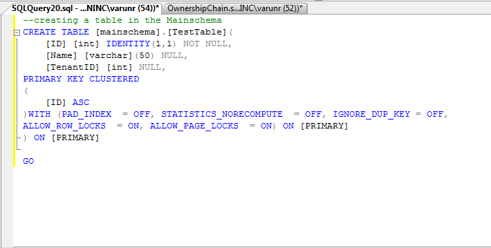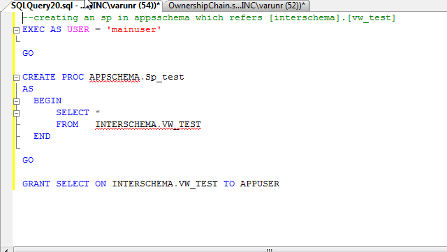 Consider the table Testtable contained in the schema called Mainschema which is owned by a user ‘mainuser’. we can create a view named vw_test in another schema called ‘interschema’ with another user called ‘interuser’ . we are giving acess to the application using an SP who is contained in another schema called ‘appschema’ and user owns the schema is ‘appuser’ . The SP is selecting the data from the vw_test.